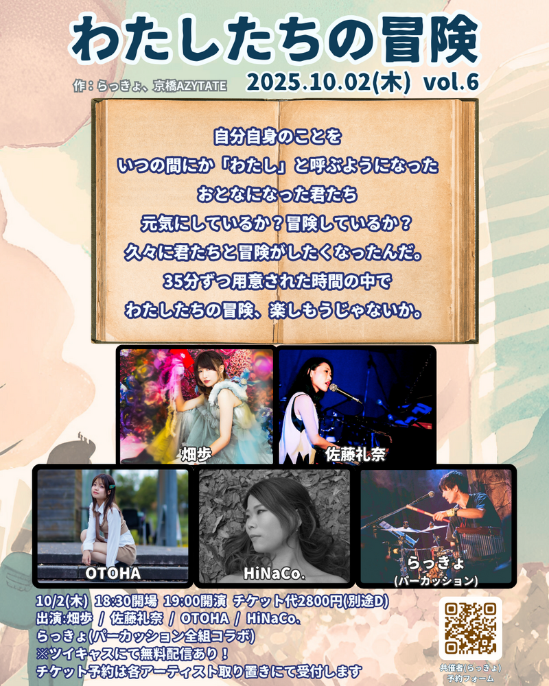 京橋AZYTATE Schedule 2025/10/02(木) 京橋AZYTATE 地図を表示 10月2日 @京橋AZYTATE らっきょ&AZYTATE企画 『わたしたちの冒険vol.6』 開場18:30 開演19:00 ¥2800(1D別) [出演] 佐藤礼奈 HiNaCo. OTOHA 畑歩 らっきょ(全組コラボ) 20:20〜出演予定! 35分ステージ 生配信 URLをコピーする 報告する