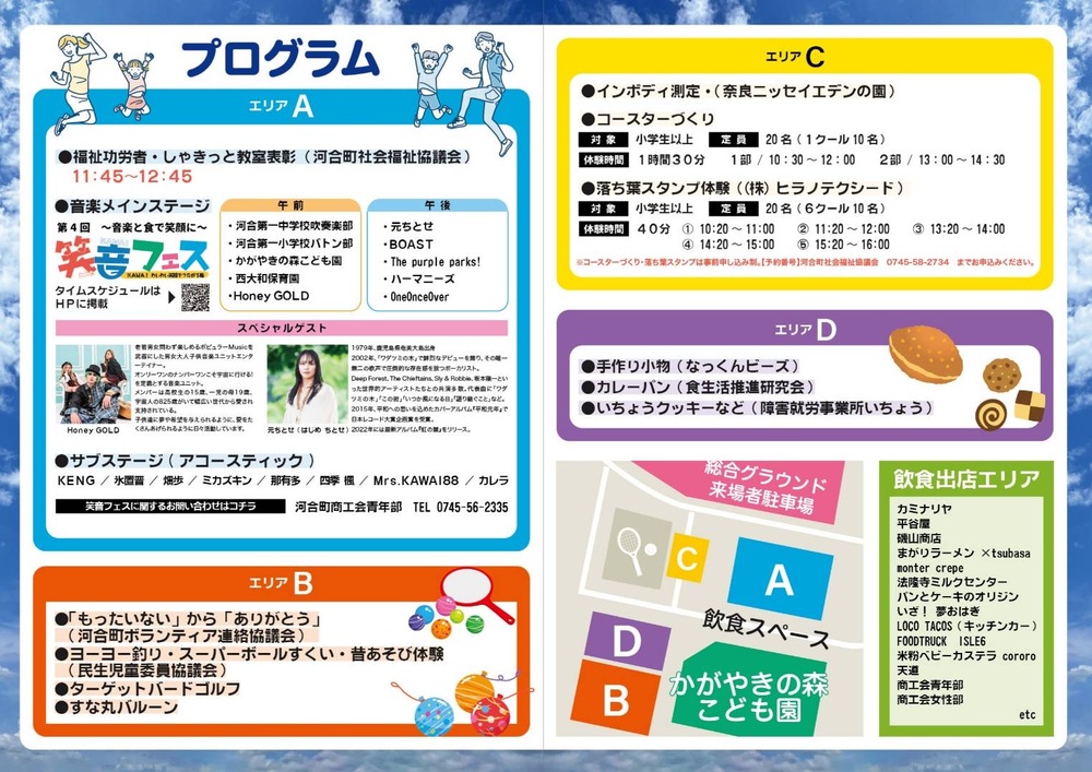 KAWAI 笑音フェス Schedule 2025/10/26(日) 河合町総合スポーツ公演 地図を表示 10月26日 ふれあいの集い内 「KAWAI 笑音フェス」 📍河合町総合スポーツ公園 🕑10:00〜16:00 入場無料 出演者: 【メインステージ】 元ちとせ/BOAST/The pueple parks!/ハーマニーズ/OneOnceOver 【サブステージ】 KENG/氷置晋/畑歩/ミカズキン/那由多/四季楓/Mrs.Kawaiiii88&Kids/カレラ 13:30〜出演予定! URLをコピーする 報告する